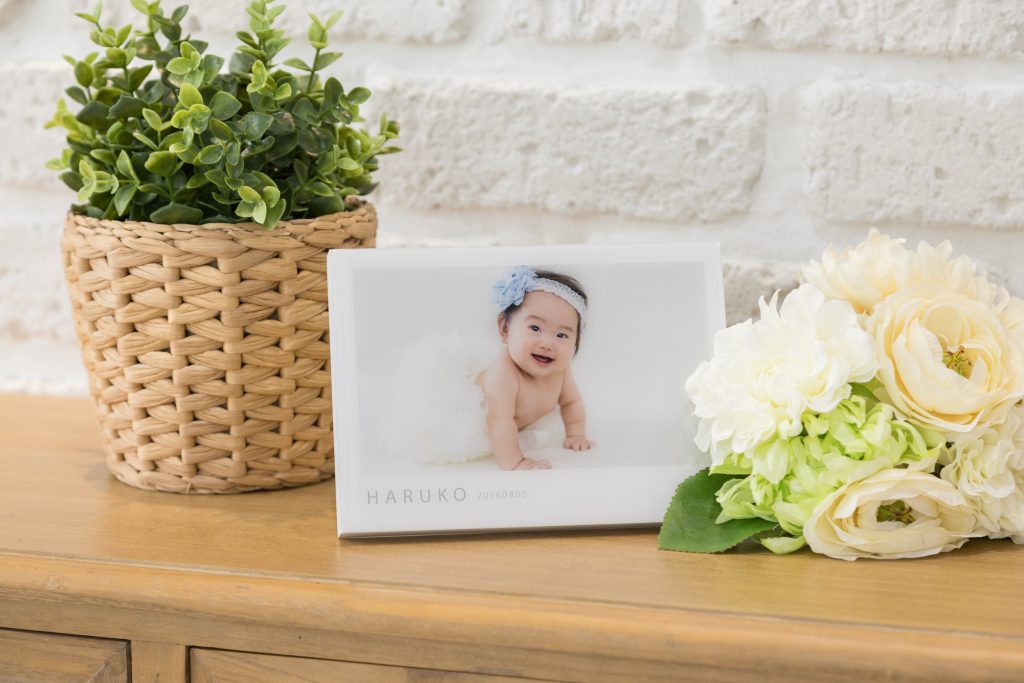 表面の樹脂加工によりぷっくりとしたフォトフレーム。お名前と撮影日が入ります。側面が白いものと黒いものの2種類からお選びいただけます。